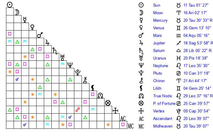 | Sun | 11 Taurus 1 | 11 Taurus 34 | 17 Leo 45 |