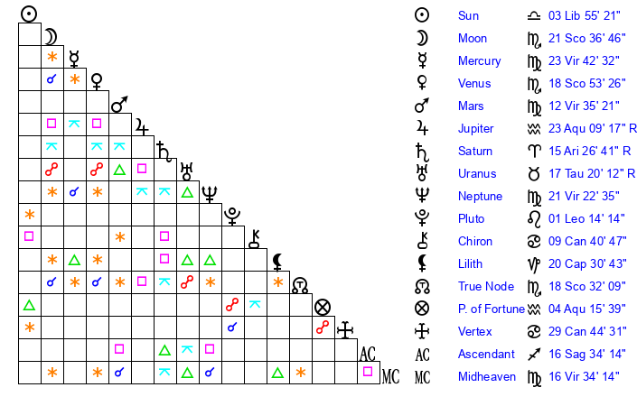 | Venus | 18 Scorpio 53 | 10 Virgo 1 | 22 Scorpio 39 |