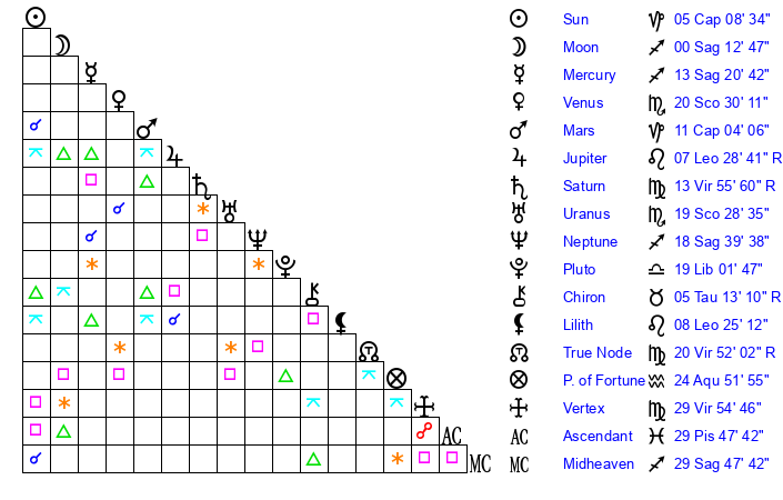 Sun | 5 Capricorn 9 | 6 Capricorn 0 | 21 Aquarius 56 |