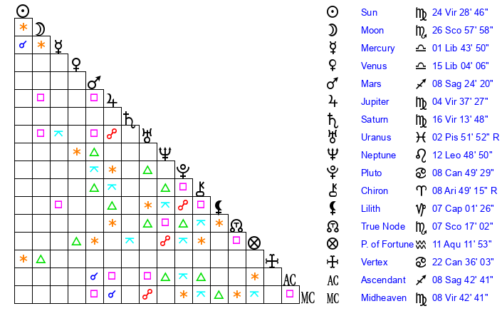 | Saturn | 16 Virgo 51 | 28 Pisces 40 | 25 Virgo 29 |