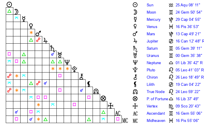 | Saturn | 5 Gemini 56 | 18 Pisces 54 | 12 Gemini 20 |