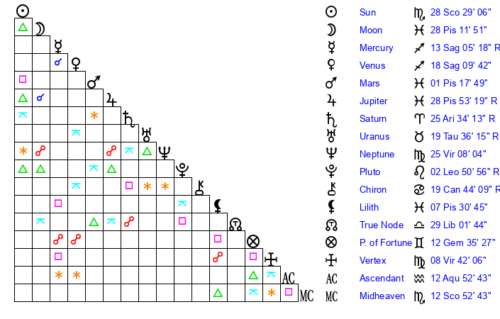 | Moon | 28 Pisces 16 | 15 Sagittarius 11 | 16 Taurus 18 |