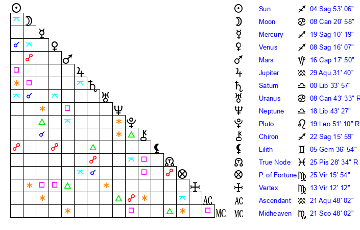 Sun | 4 Sagittarius 53 | 5 Sagittarius 57 | 20 Aquarius 9 |