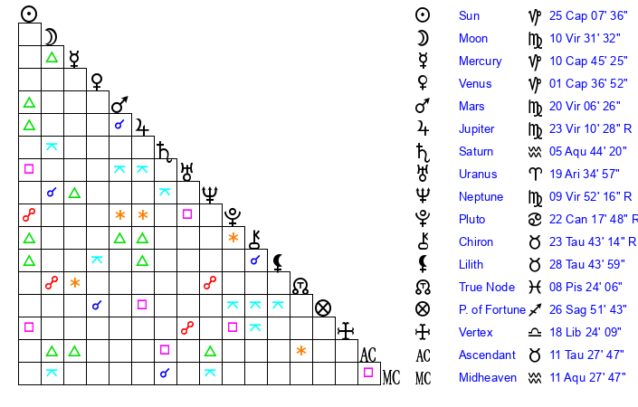 | Neptune | 9 Virgo 52 | 27 Pisces 33 | 7 Virgo 39 |