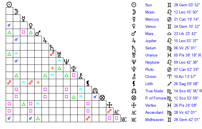 | Neptune | 9 Leo 42 | 2 Aries 6 | 13 Leo 12 |