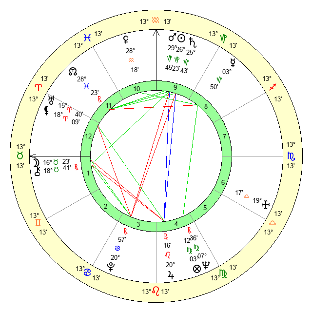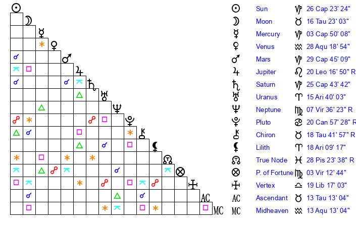 | Moon | 16 Taurus 18 | 12 Virgo 30 | 12 Libra 39 |
