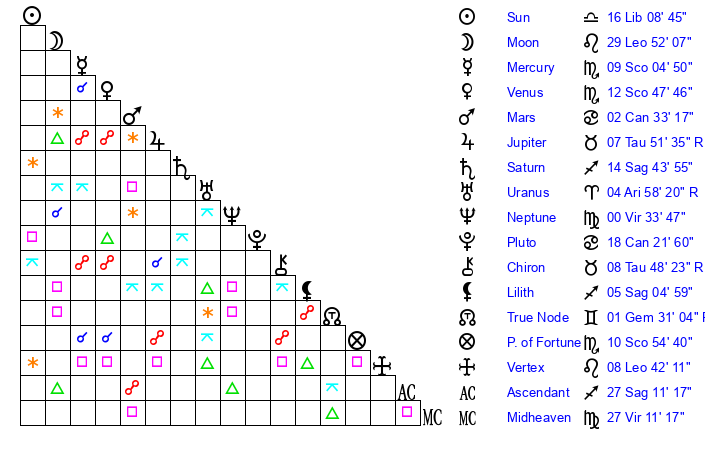 | Sun | 16 Libra 9 | 16 Libra 39 | 24 Capricorn 4 |