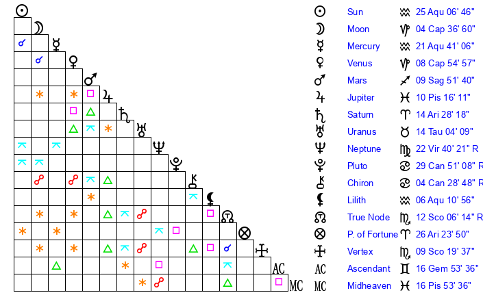| Sun | 25 Aquarius 7 | 26 Aquarius 15 | 20 Taurus 6 |