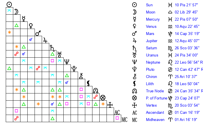 | Sun | 10 Pisces 22 | 11 Pisces 22 | 17 Gemini 7 |