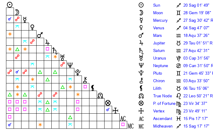 | Mercury | 27 Sagittarius 30 | 0 Sagittarius 57 | 9 Aries 42 |