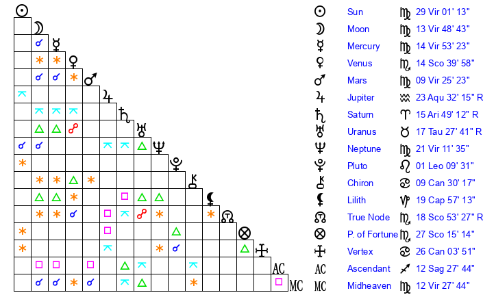 | Neptune | 21 Virgo 11 | 0 Aries 46 | 23 Virgo 19 |