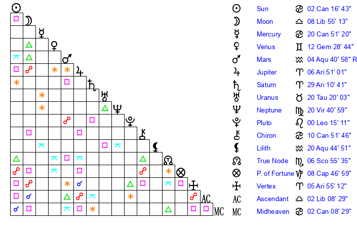 | Moon | 8 Libra 59 | 23 Gemini 25 | 4 Sagittarius 29 |