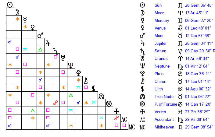 | Sun | 28 Gemini 37 | 29 Gemini 37 | 29 Virgo 56 |