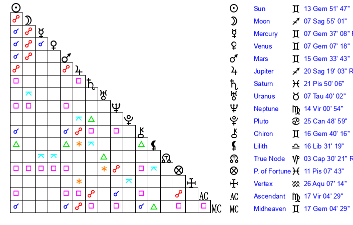 | Sun | 13 Gemini 51 | 14 Gemini 19 | 9 Virgo 3 |