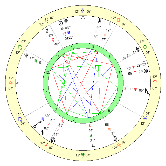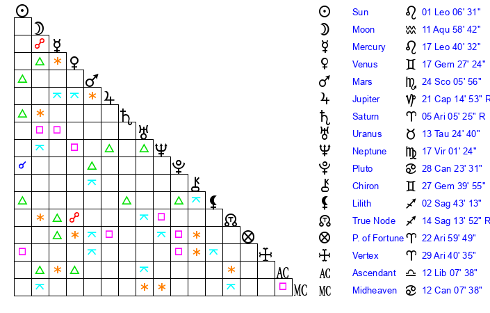 | Moon | 12 Aquarius 5 | 27 Cancer 18 | 4 Taurus 1 |