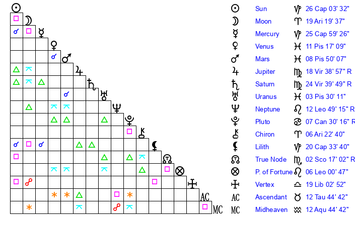 | Mercury | 25 Capricorn 59 | 12 Capricorn 9 | 28 Aries 51 |