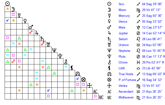 | Moon | 29 Virgo 50 | 28 Aquarius 44 | 0 Virgo 44 |
