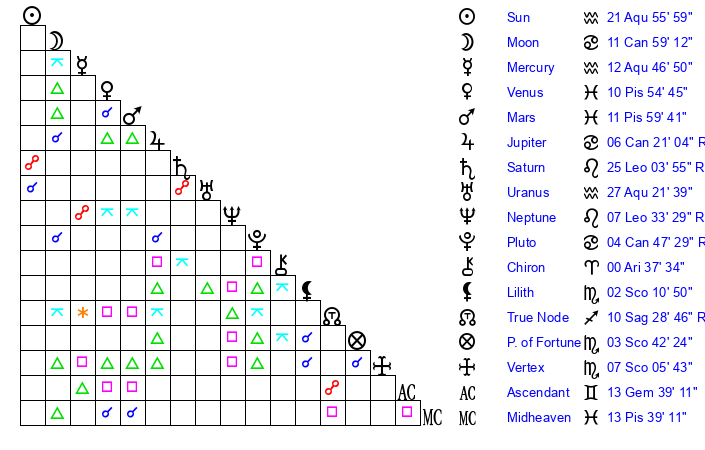 | Sun | 21 Aquarius 56 | 23 Aquarius 13 | 6 Gemini 18 |