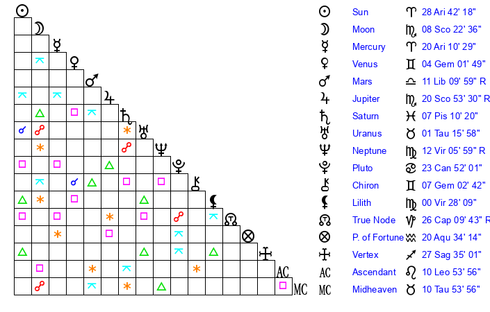 | Moon | 8 Scorpio 27 | 13 Capricorn 43 | 29 Aquarius 36 |