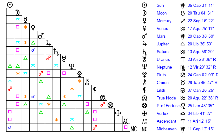 | Sun | 5 Capricorn 31 | 6 Capricorn 26 | 7 Aries 19 |