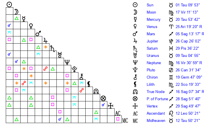 | Venus | 25 Aries 18 | 26 Pisces 2 | 11 Gemini 16 |
