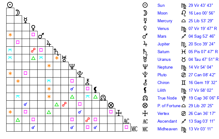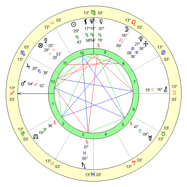 | Neptune | 14 Virgo 53 | 0 Aries 44 | 16 Virgo 45 |