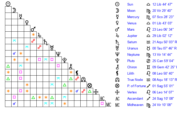 | Moon | 20 Virgo 34 | 7 Aries 24 | 21 Capricorn 5 |