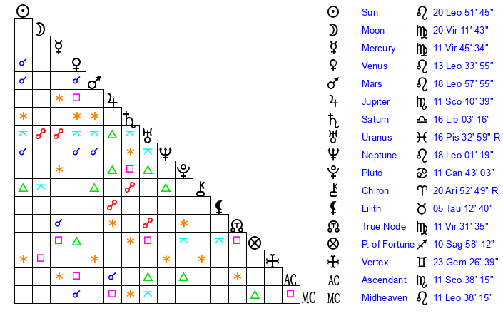 | Sun | 20 Leo 52 | 22 Leo 9 | 1 Sagittarius 24 |
