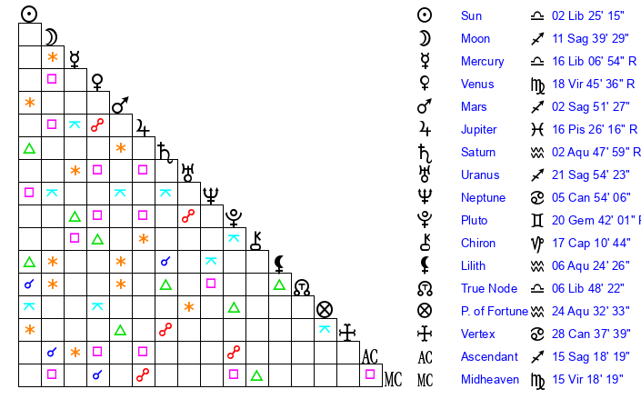 | Venus | 18 Virgo 44 | 8 Virgo 47 | 25 Sagittarius 34 |