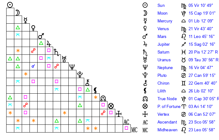 | Moon | 15 Capricorn 18 | 7 Scorpio 46 | 21 Aries 44 |