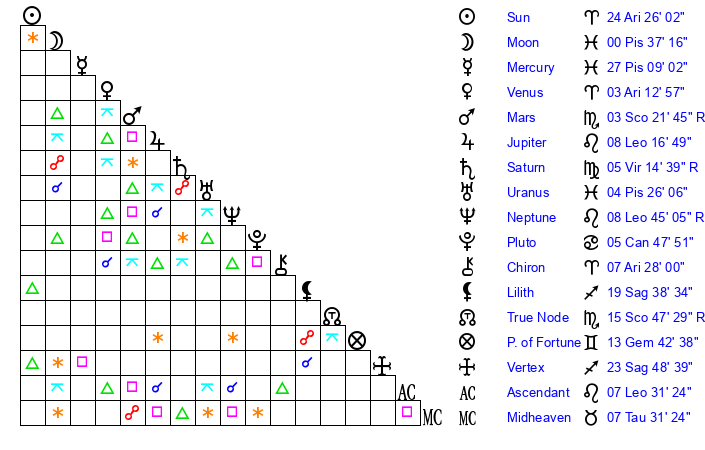 | Sun | 24 Aries 26 | 25 Aries 0 | 5 Leo 16 |