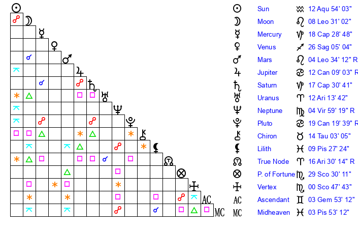 | Sun | 12 Aquarius 54 | 14 Aquarius 6 | 16 Taurus 10 |