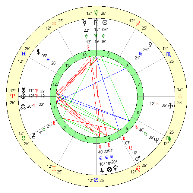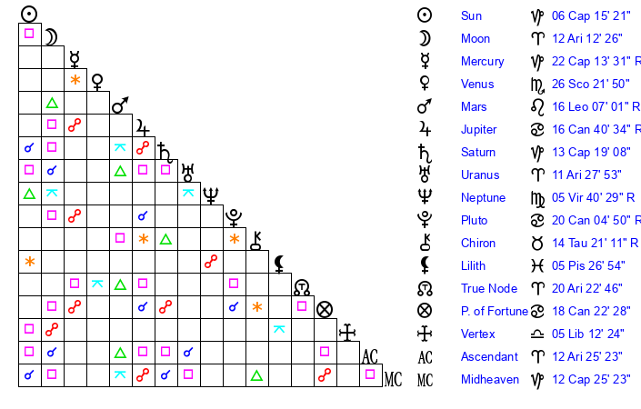 | Moon | 12 Aries 12 | 10 Sagittarius 59 | 25 Virgo 12 |