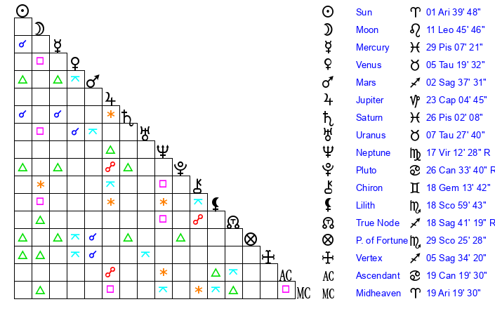 | Sun | 1 Aries 39 | 2 Aries 19 | 27 Gemini 0 |