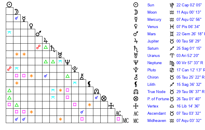 | Mercury | 7 Aquarius 3 | 6 Capricorn 11 | 29 Aries 21 |
