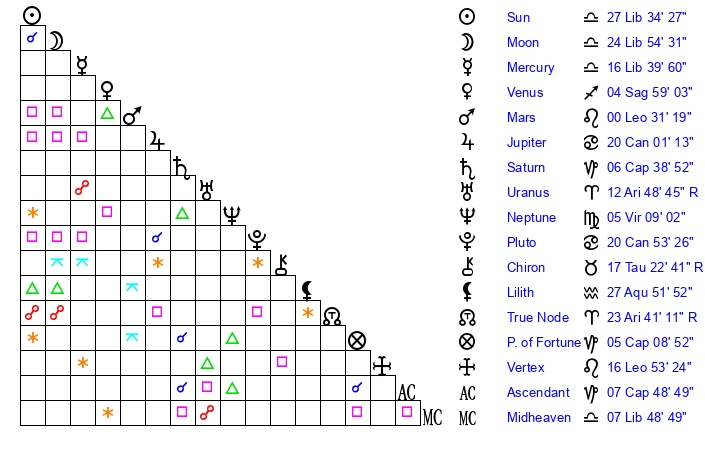 | Mercury | 16 Libra 40 | 21 Scorpio 1 | 9 Capricorn 20 |