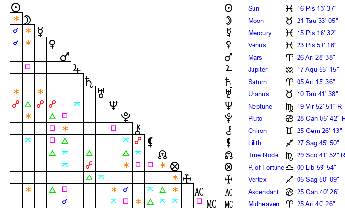 Sun | 16 Pisces 13 | 17 Pisces 7 | 11 Gemini 14 |