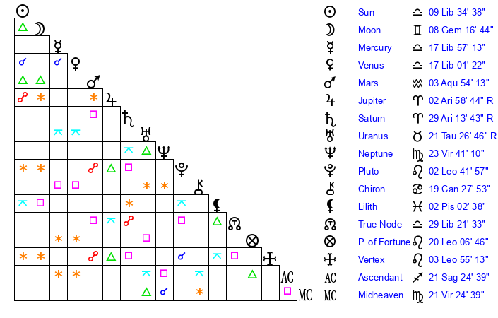| Venus | 17 Libra 2 | 17 Virgo 24 | 4 Aquarius 13 |