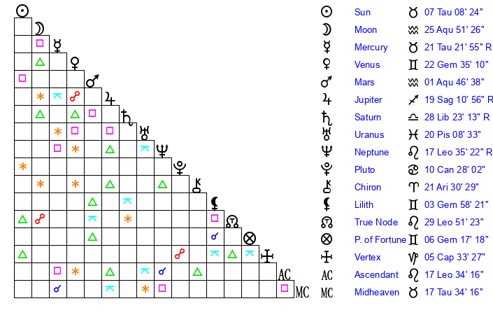 | Sun | 7 Taurus 8 | 7 Taurus 41 | 13 Leo 55 |