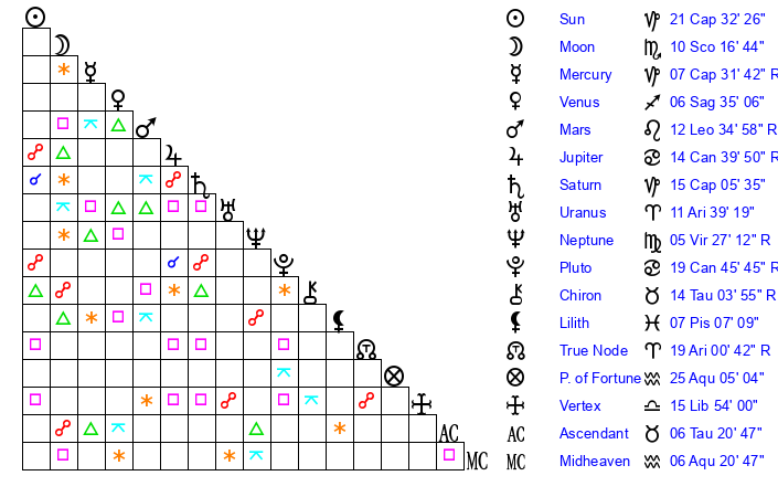 | Mercury | 7 Capricorn 31 | 6 Capricorn 11 | 12 Taurus 55 |