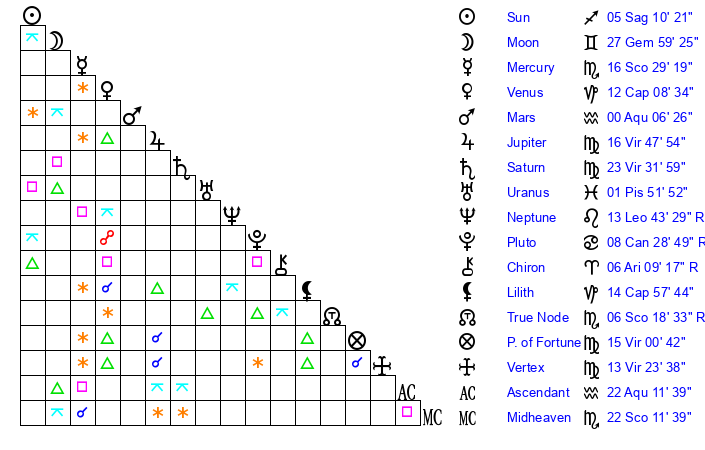 | Sun | 5 Sagittarius 10 | 5 Sagittarius 42 | 21 Pisces 35 |