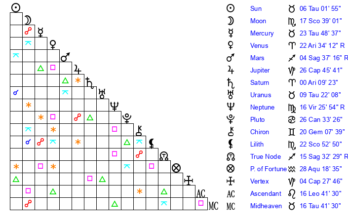 | Saturn | 0 Aries 16 | 27 Pisces 19 | 5 Aries 12 |