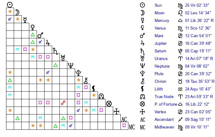 | Sun | 25 Virgo 2 | 26 Virgo 2 | 0 Capricorn 8 |