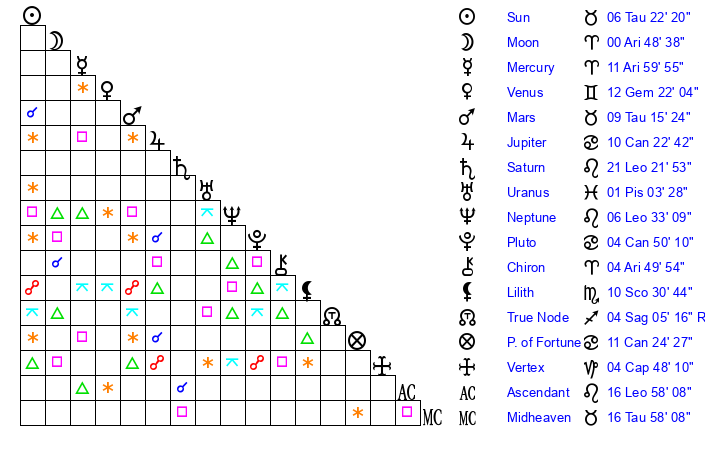 | Sun | 6 Taurus 22 | 7 Taurus 41 | 17 Leo 57 |