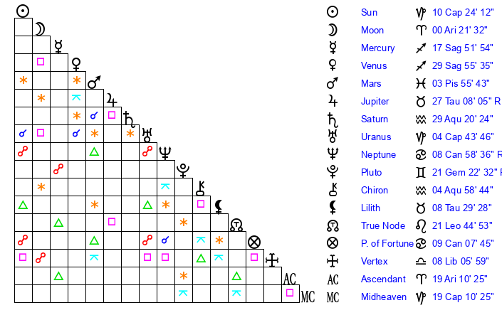 | Sun | 10 Capricorn 24 | 11 Capricorn 32 | 9 Taurus 26 |
