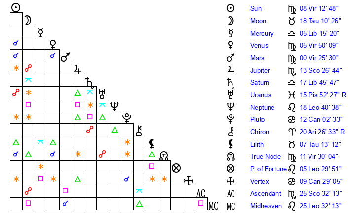 | Neptune | 18 Leo 40 | 1 Aries 20 | 20 Leo 16 |