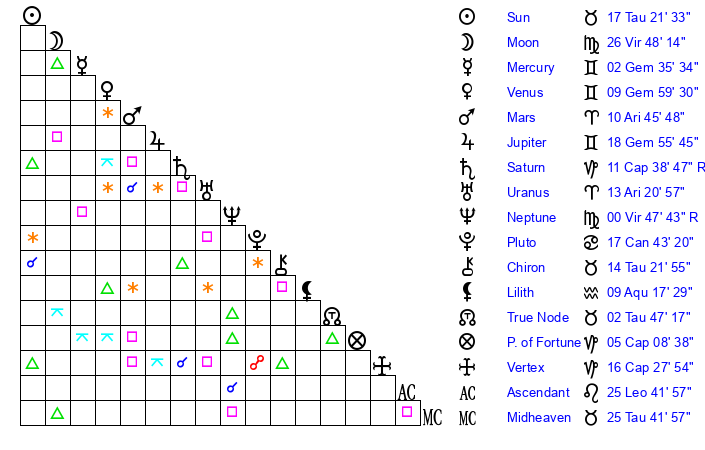 | Sun | 17 Taurus 22 | 18 Taurus 21 | 18 Leo 17 |