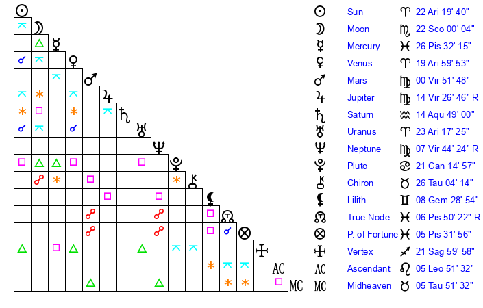 | Moon | 21 Scorpio 57 | 19 Libra 36 | 11 Aries 32 |
