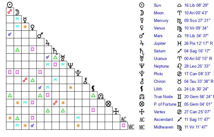 | Moon | 9 Aries 55 | 3 Gemini 21 | 12 Scorpio 4 |