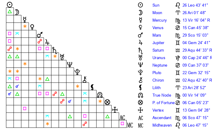 | Moon | 26 Aries 1 | 22 Cancer 52 | 12 Virgo 33 |